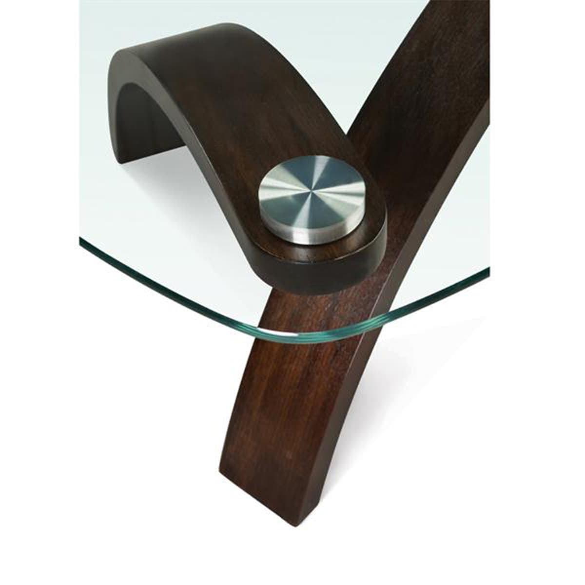The Amari Coffee Table collection brings a distinctive contemporary look and urban feel with its unique crisscrossed arched bases and shaped glass tops. Featuring bases crafted of walnut veneers and bent plywood solids and tabletops featuring tempered glass and stainless-steel pucks this collection provides a unique, modern look making a bold eye-catching statement.