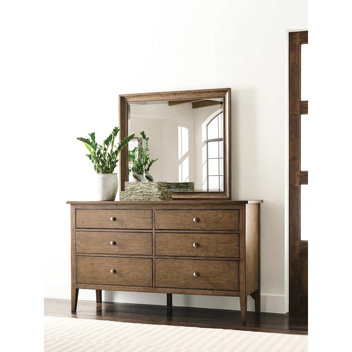 The Arbor Glenwood Mirror is crafted from select pine solids with beveled mirror glass; this versatile mirror combines classic and transitional style. It can be mounted on a dresser or hung on the wall, adding timeless elegance to any room.