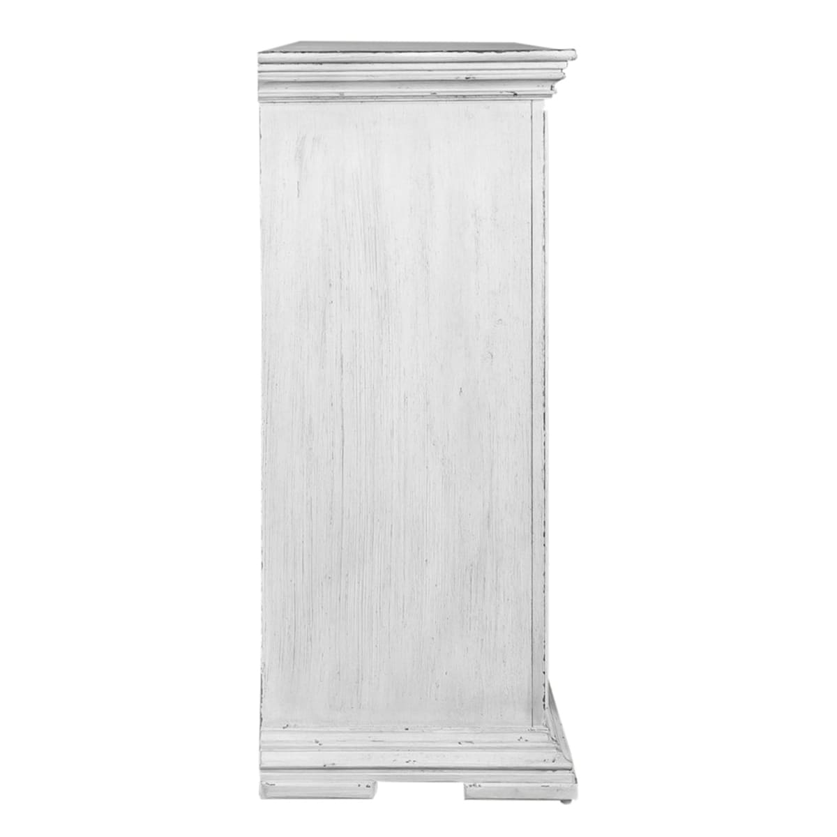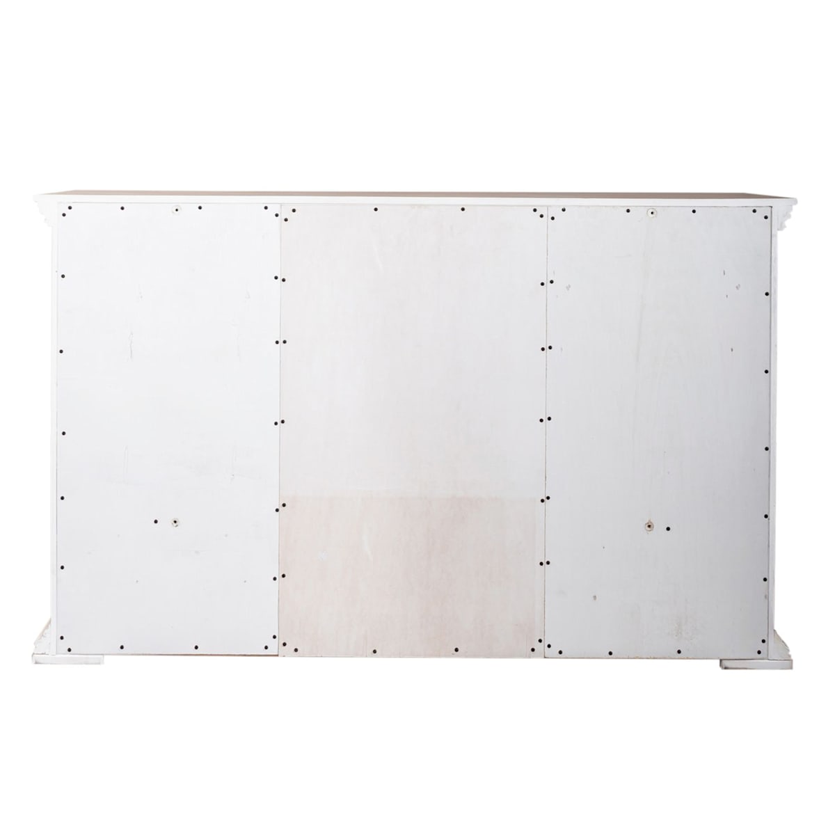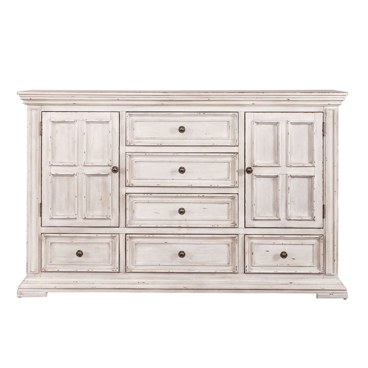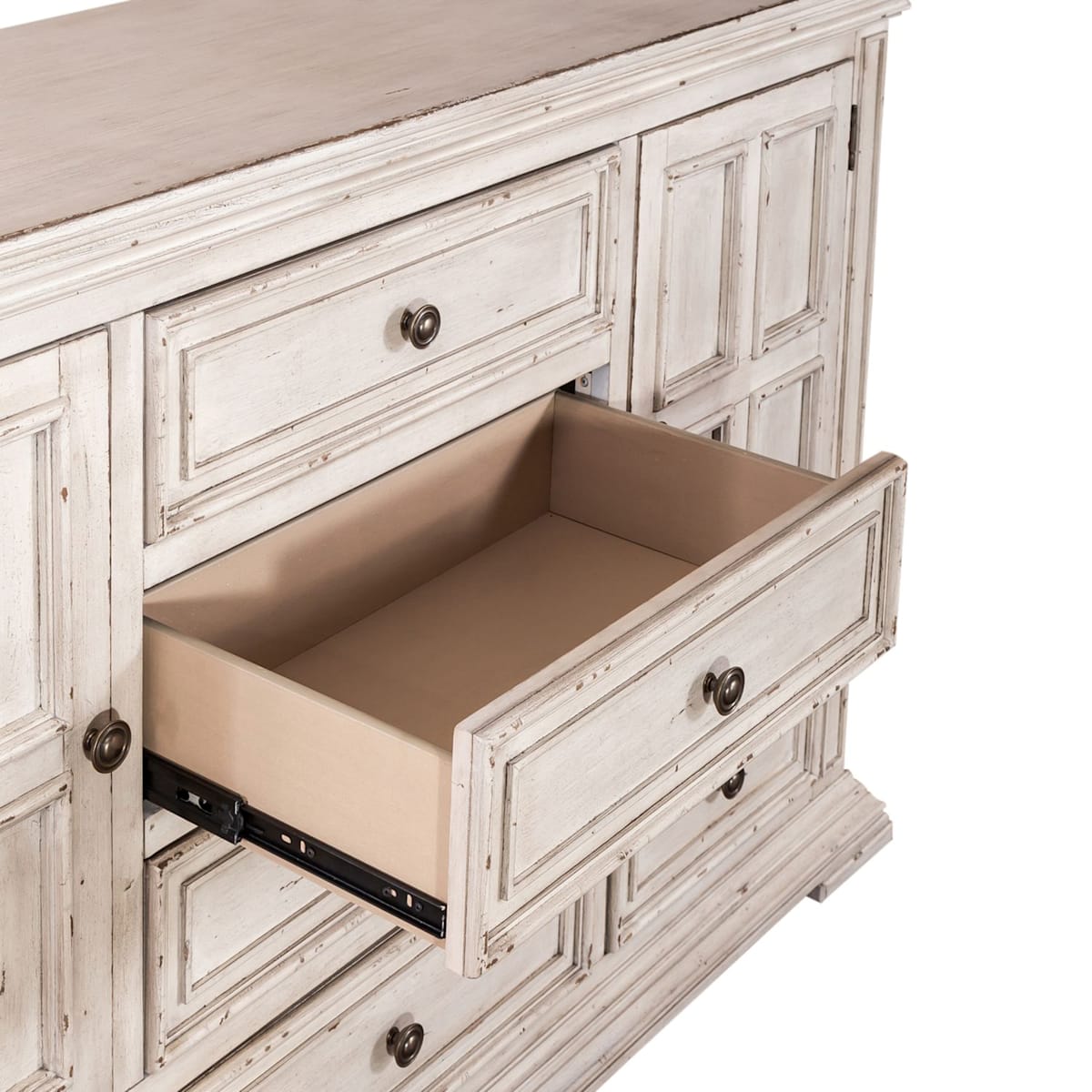 The Big Valley 6 Drawer Dresser features six drawers and two doors for plenty of storage. It is crafted of Asian hardwood solids and birch veneers with a heavy distressing Whitestone finish. The drawers are constructed using French and English dovetail joinery and full extension metal side guides. The top drawers are felt lined and the bottom drawers are cedar lined. There is open storage behind each door. The knob hardware is finished in Antique Pewter.