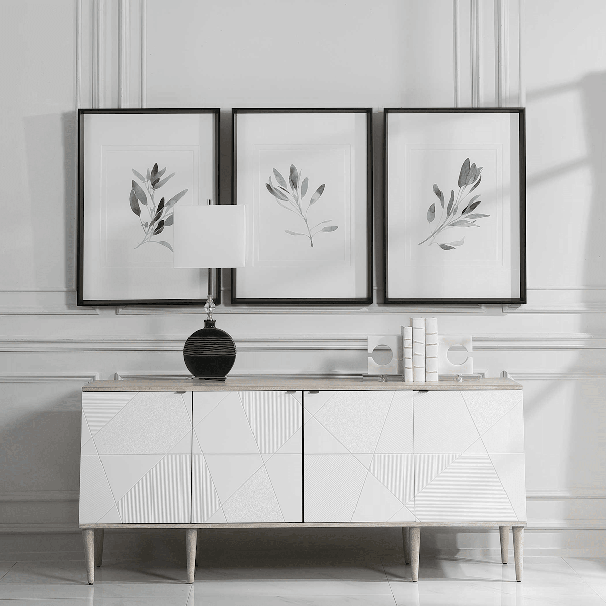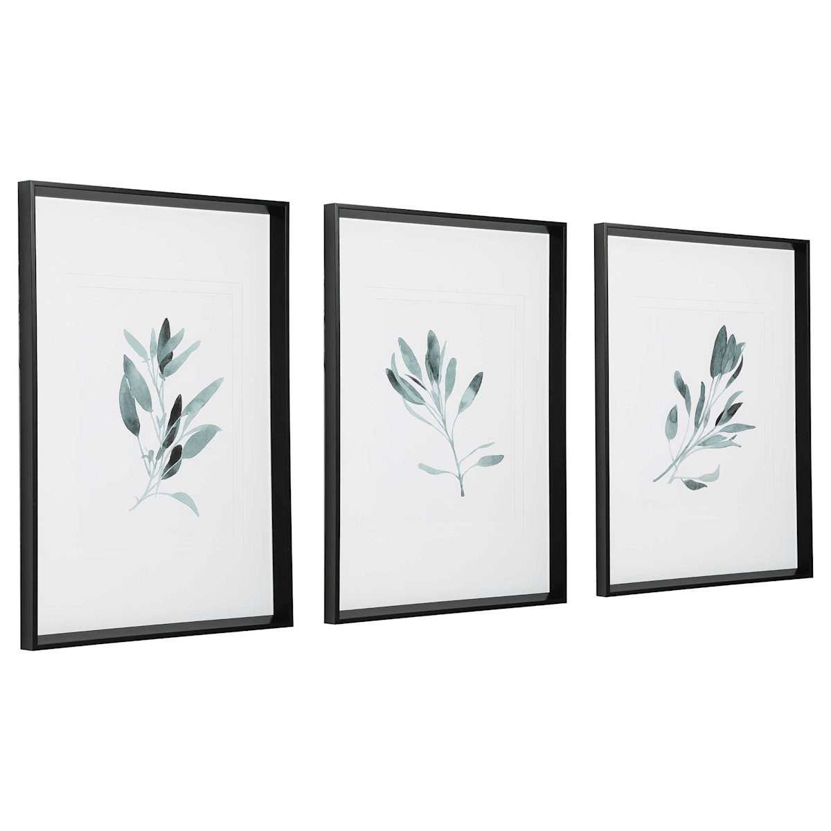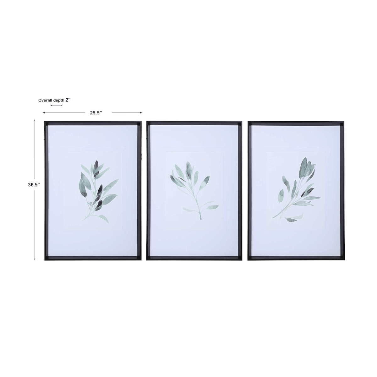 Botanical Study Set/3 Wall Art - A nod to modern farmhouse style, this set of artwork showcases individual sage branches printed in a watercolor style. Cool shades of green and gray blue are complemented by elegant double white matting and a petite matte black frame, under glass. Artwork by Emma Scarvey.