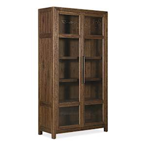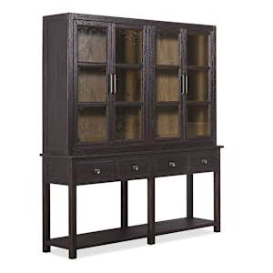 The Cambric Display Cabinet is beautifully crafted from white oak veneers and select solids, finished in a charming distressed Breve finish that adds warmth and character to any space. Its sleek design is highlighted by deep silver finish hardware pulls, offering a sophisticated contrast. Featuring two glass doors that open to adjustable glass shelves, and two bottom doors that reveal one adjustable shelf, this cabinet provides ample storage and organization options. Additionally, it includes wire management to keep cords neatly organized and hand holds for easy handling, making it a stunning and functional piece that would complement any home with its transitional style.