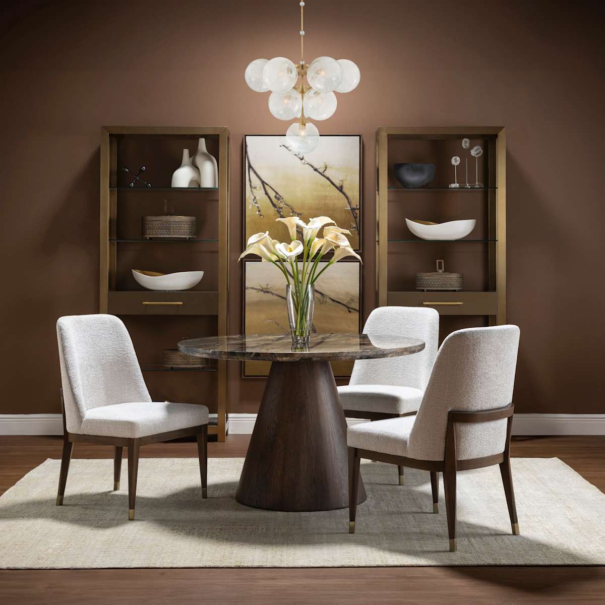 The Carino Upholstered Side Chair by Century Furniture is a stunning piece that combines classic craftsmanship with modern style. Crafted from oak solids, it features a rich Cocoa finish frame that adds warmth and sophistication to your dining room. The seat and back are upholstered in an Ivory performance fabric, providing comfort and a fresh contrast to the dark frame. Champagne finish metal ferrules add a stylish and unique touch. Beautiful design and attention to detail make it a perfect choice for elevating your dining room decor, offering both comfort and style for your guests.