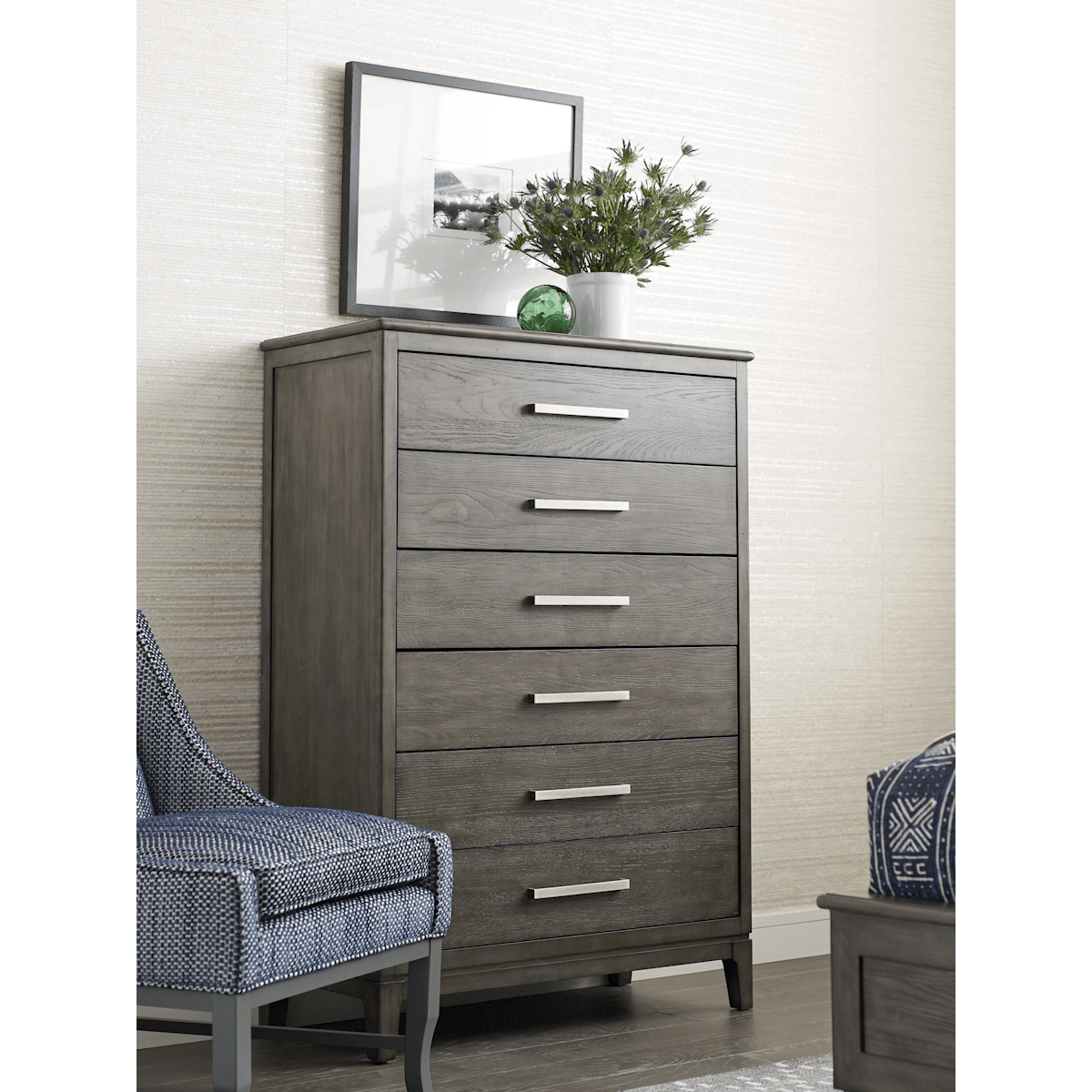 The Cascade Caitlin Chest by Kincaid is crafted of Maple and Ash in a Sable finish. The drawers feature English dovetail front and backs, soft closing drawer glides and Nickel finished hardware. The second and third drawers feature wooden dividers, allowing you to keep your belongings organized.