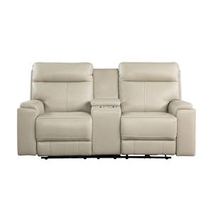 The Dexter Console Loveseat is a harmonious blend of casual styling and plush comfort. Reclining and relaxing are made easy with power reclining and headrest adjustment at the touch of a button. A USB port, located on each control panel, allows for charging of small electronics. The console features include a storage drawer and 2 stainless steel cupholders that can be concealed by a sliding armrest. Upholstered in 100% genuine leather in a dark gray, with decorative stitching details.