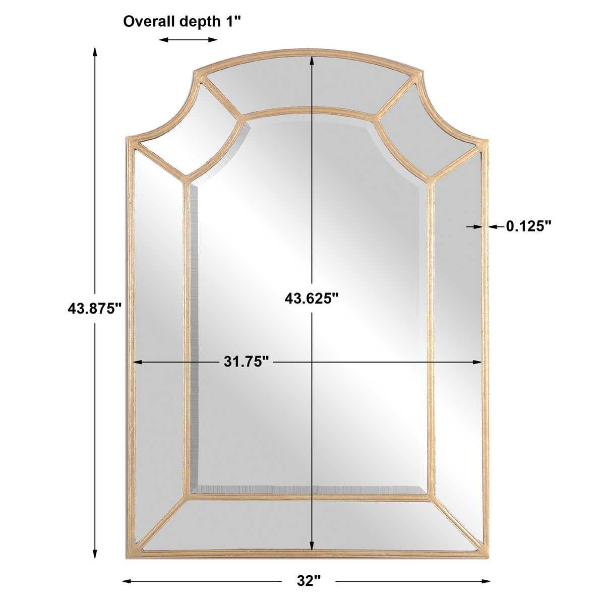 The Francoli Arched Mirror features a hand forged metal arch frame with scooped corners. It has a lightly antiqued gold leaf finish and a generous 1 1/4 inch bevel.