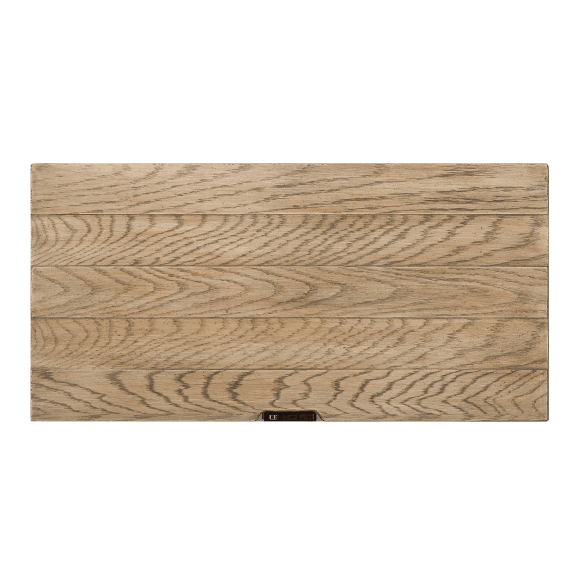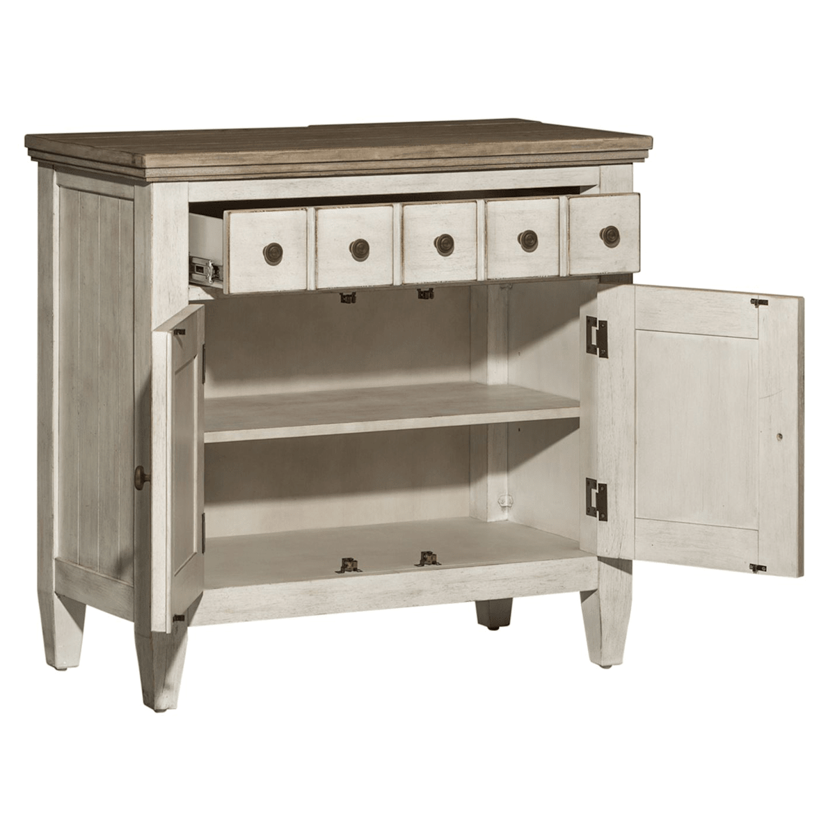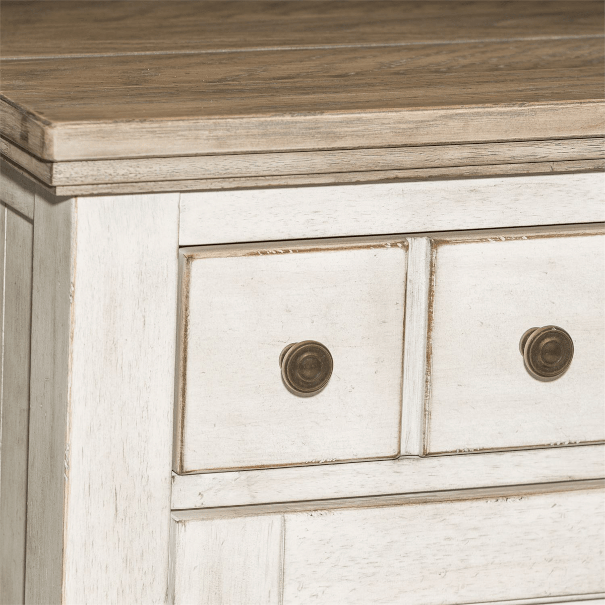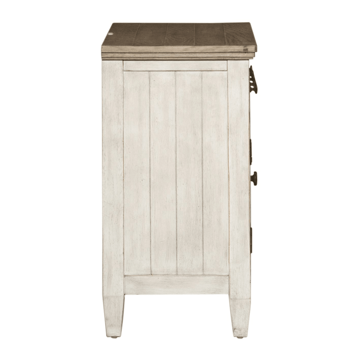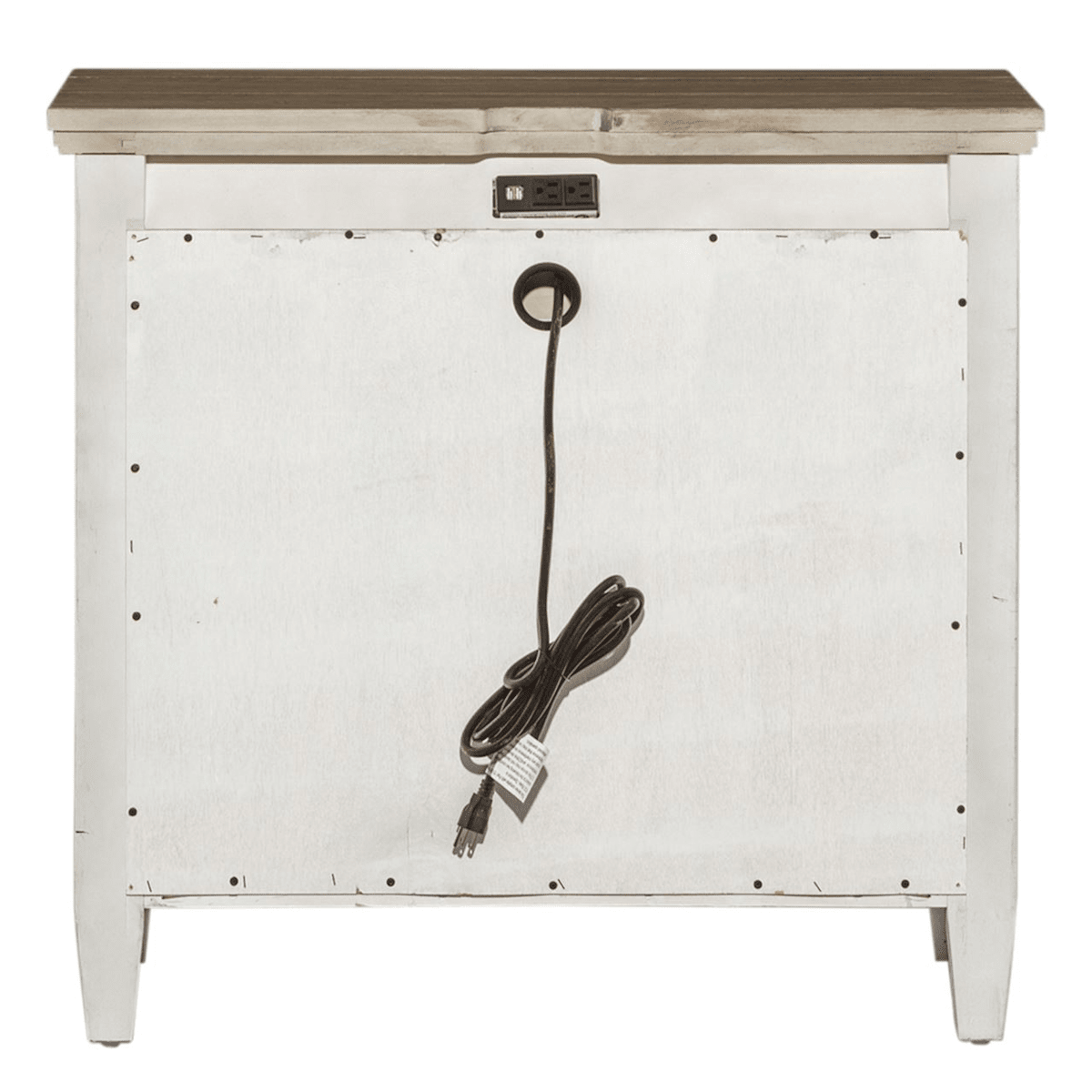 The Heartland Bedside Chest is crafted of Asian hardwood solids with cathedral White Oak and Birch veneers. The bedside chest features an Antique White body with a contrasting Tobacco finished top. French dovetail fronts, English dovetail backs and full extension metal side drawer guides provide optimal storage space. -Charging station located on back rail -Felt lined top drawer