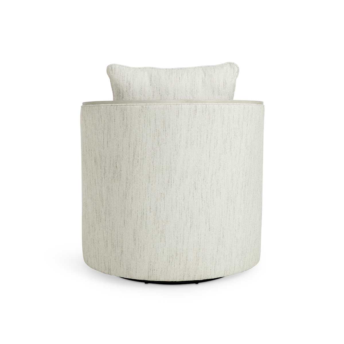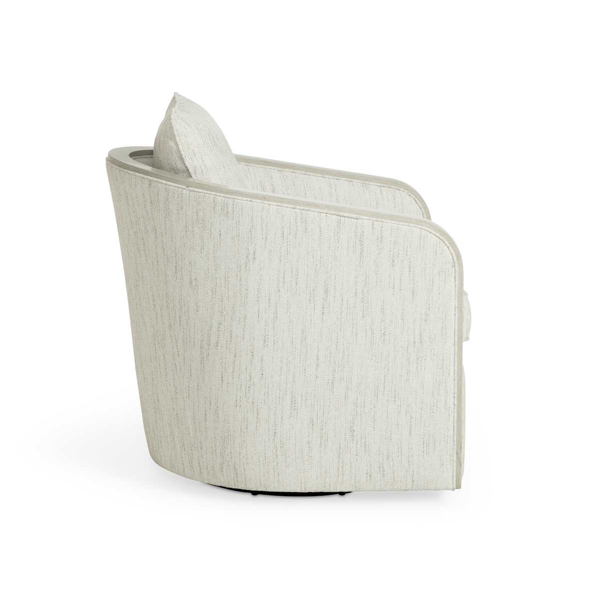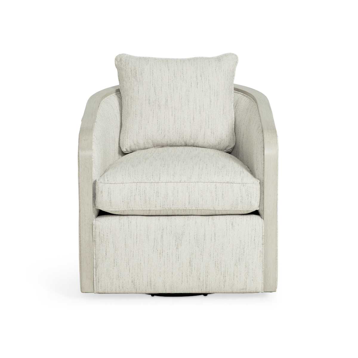 The Hughes Swivel Chair offers a sophisticated blend of modern and classic style with its smooth barrel frame, clean transitional silhouette, and exposed wood arms for a refined touch. Upholstered in a textured woven ivory fabric, this chair features a foam-wrapped straight seat cushion and a loose back cushion for comfort and support. Perfect as an accent in living rooms, bedrooms, or reading nooks, the Hughes Chair is part of our custom order program, allowing you to choose from a wide variety of fabrics and wood finishes to match your décor. This style also coordinates beautifully with the Vivian Sofa for a cohesive, designer-inspired look.
