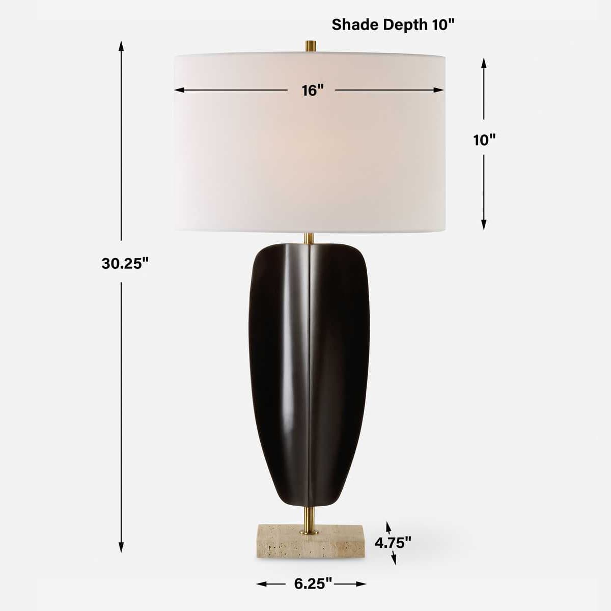The Kure Table Lamp is crafted from hand forged iron finished in matte black, replicating a tribal sculpture that's suspended by plated brass columns and displayed on a thick travertine foot. The oval hardback shade is covered in a white linen fabric.