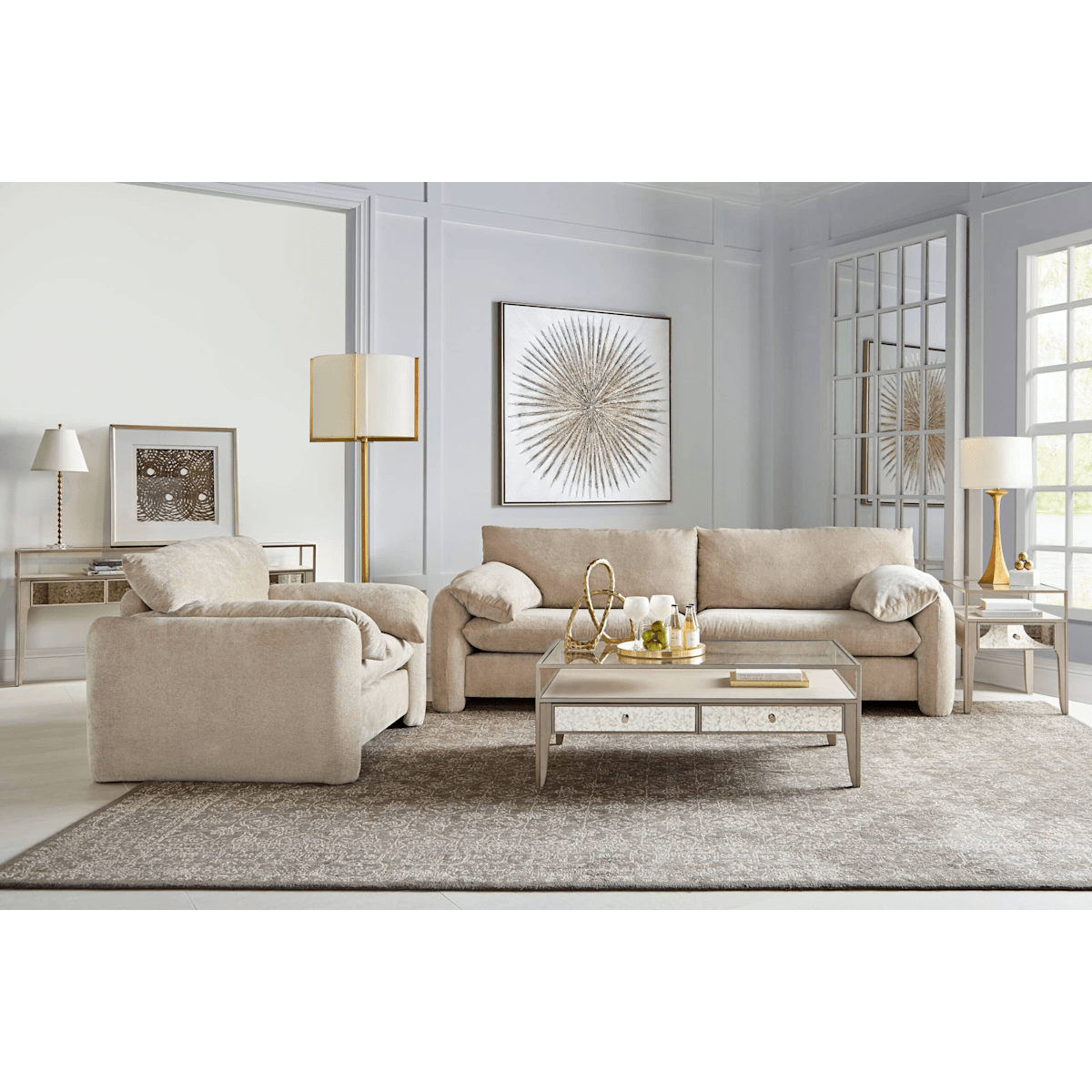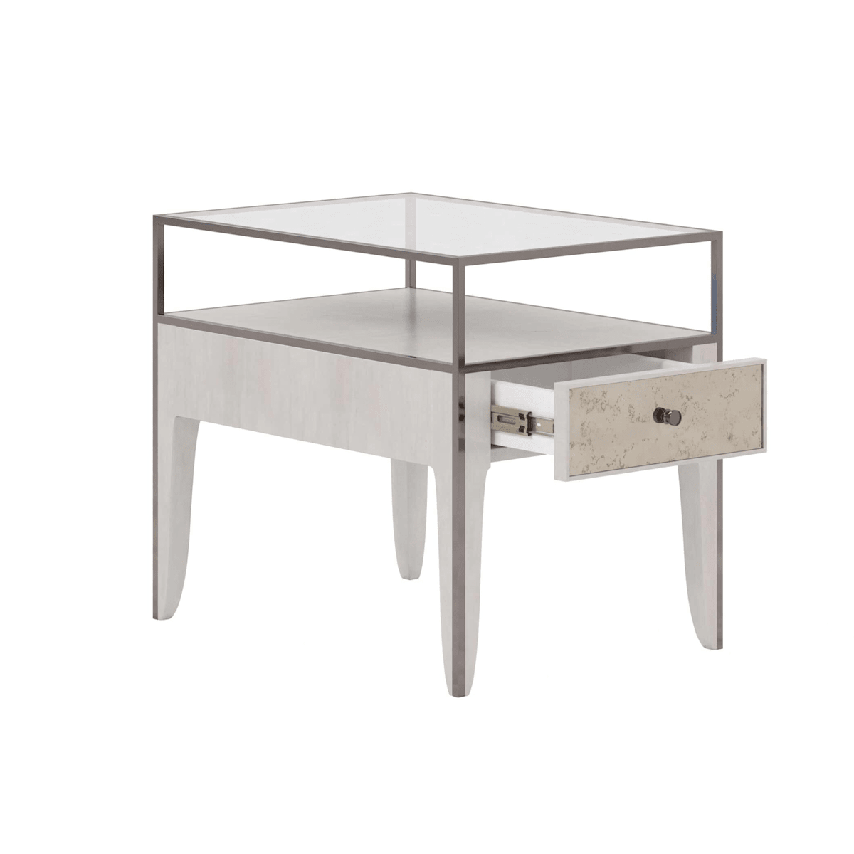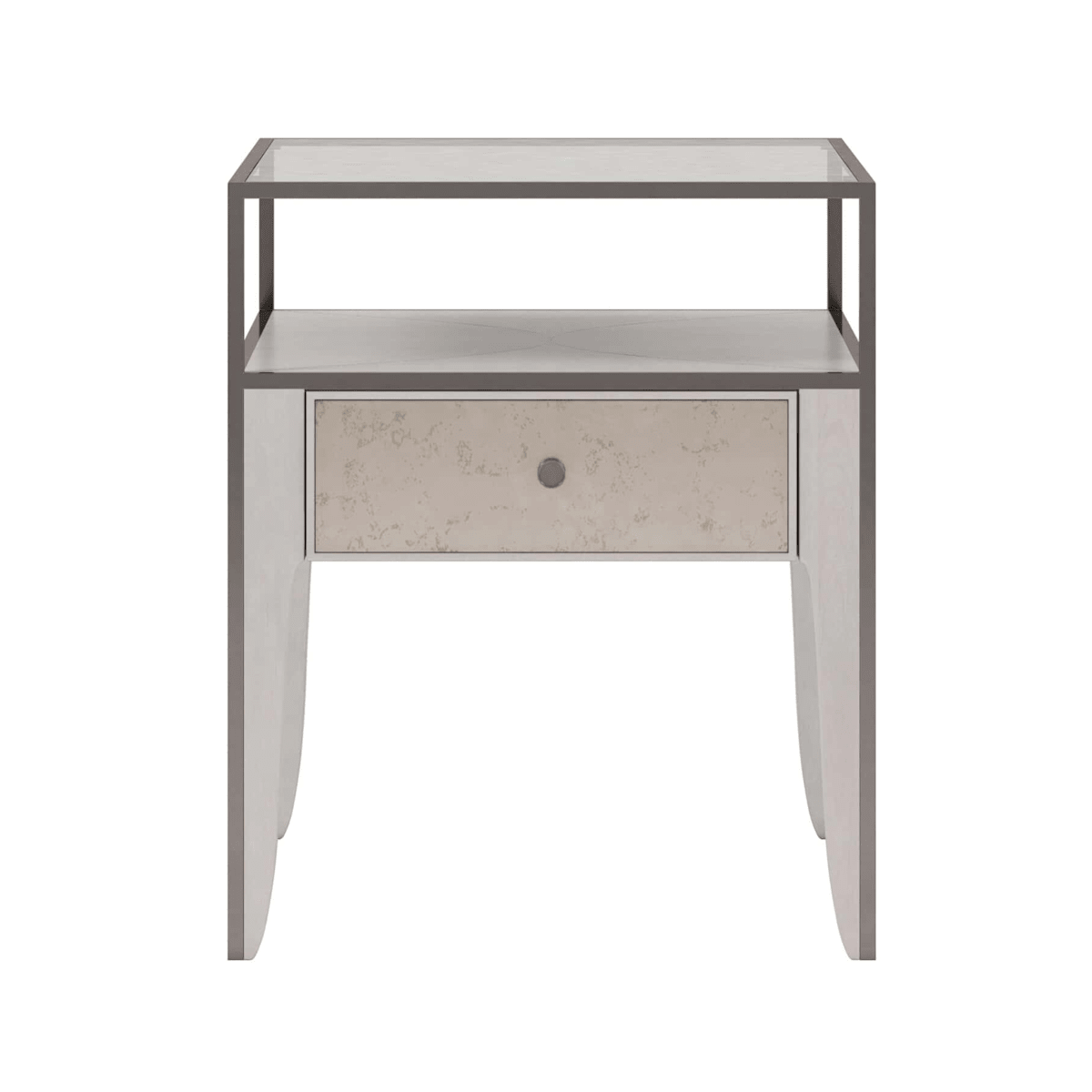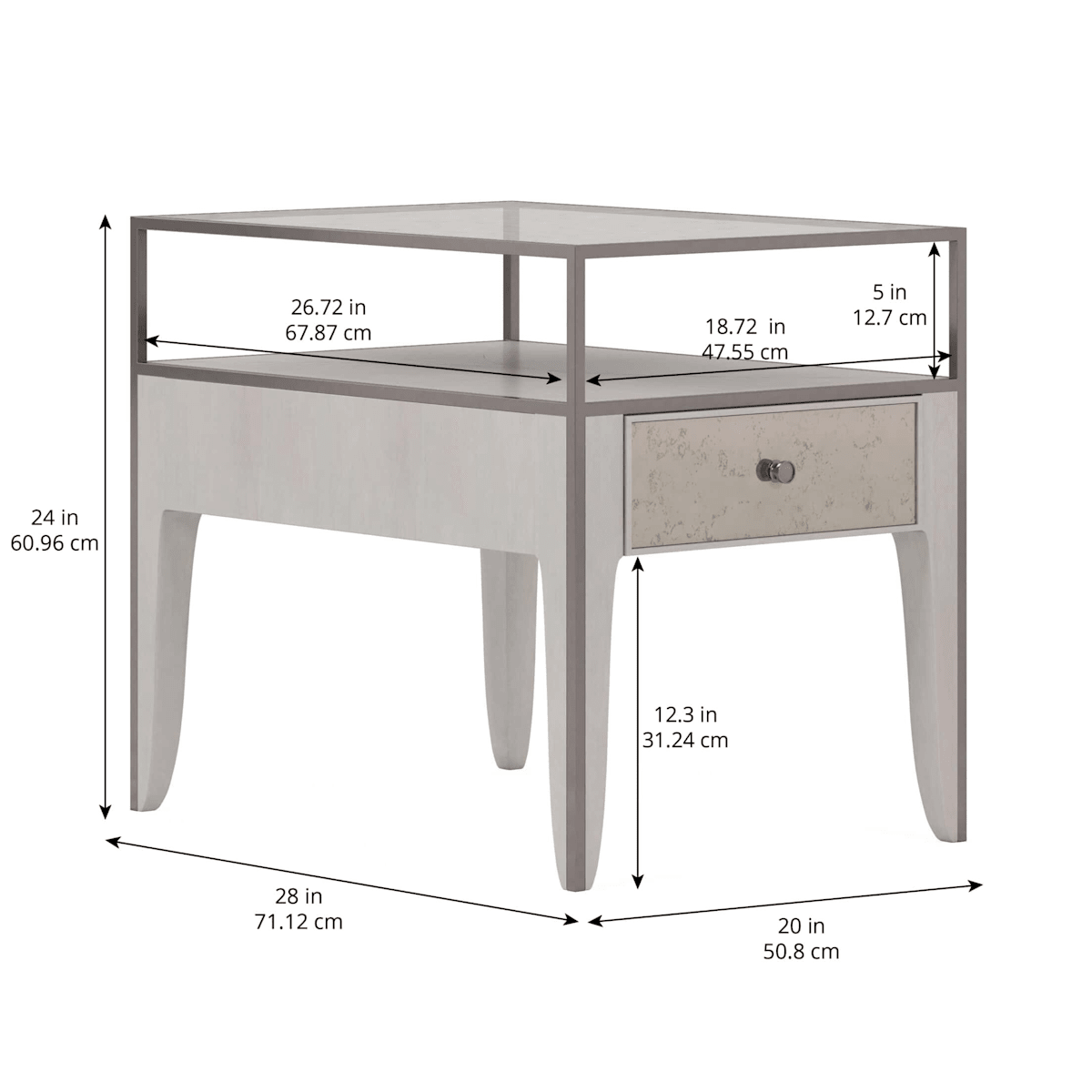 Simplicity is always in fashion. This versatile end table with a raised glass top is a lovely addition to any room that needs a compact piece offering both storage and style. The natural beauty of maple veneer finished in dove gray contrasts with a sleek metal frame and antiqued mirrored details, perfect for all forms of transitional interiors.