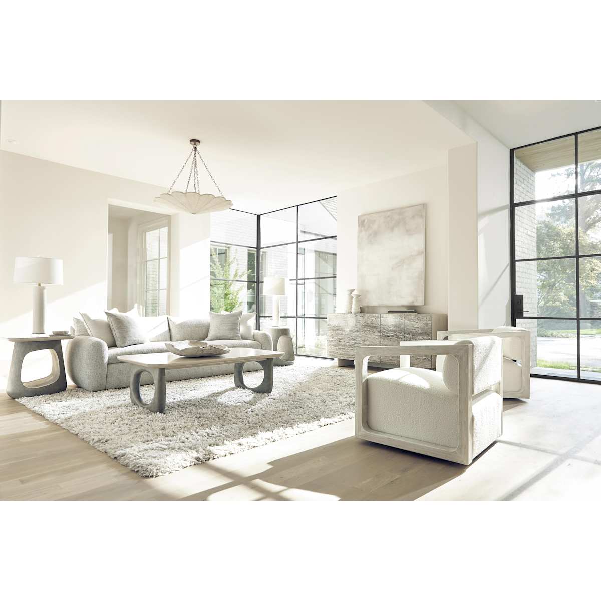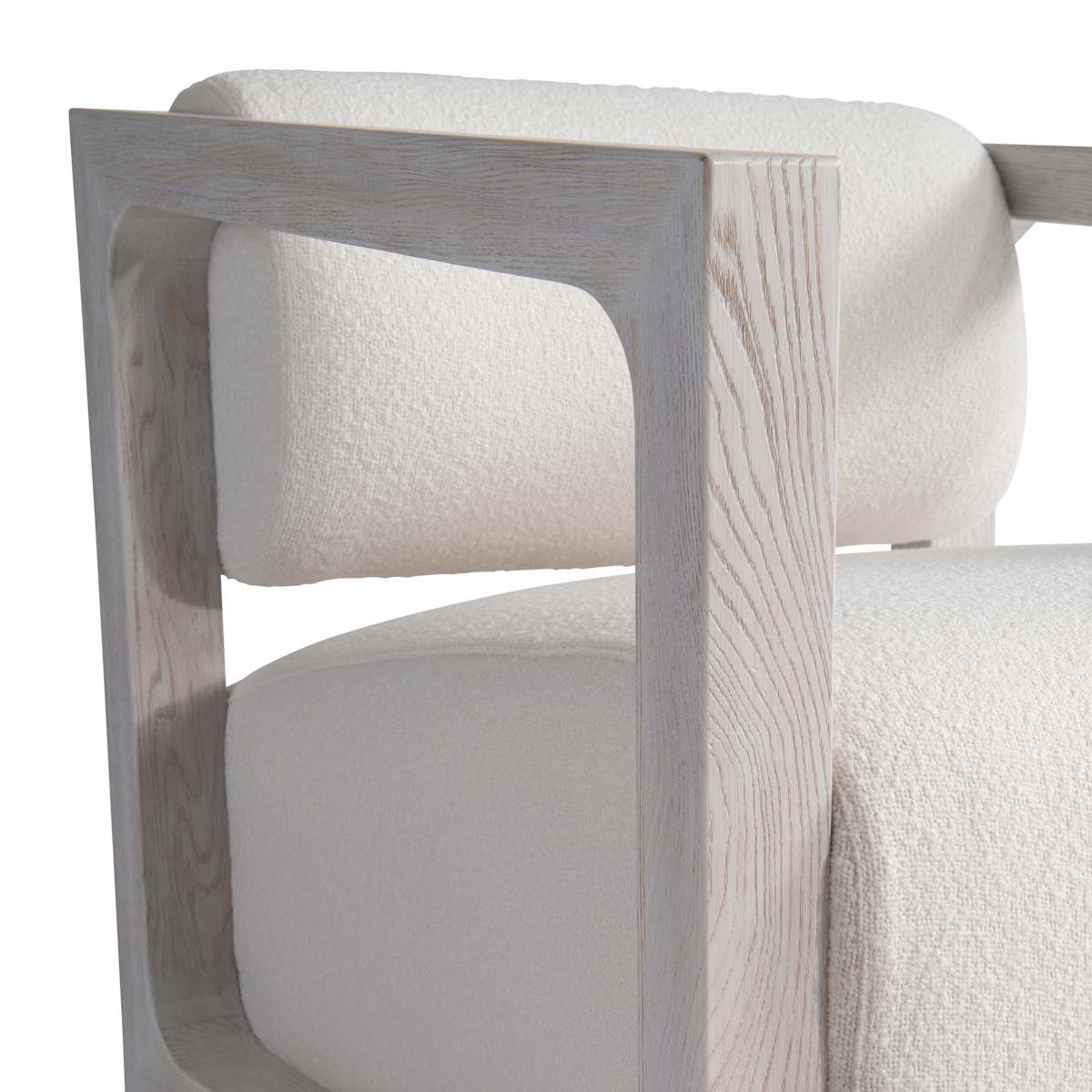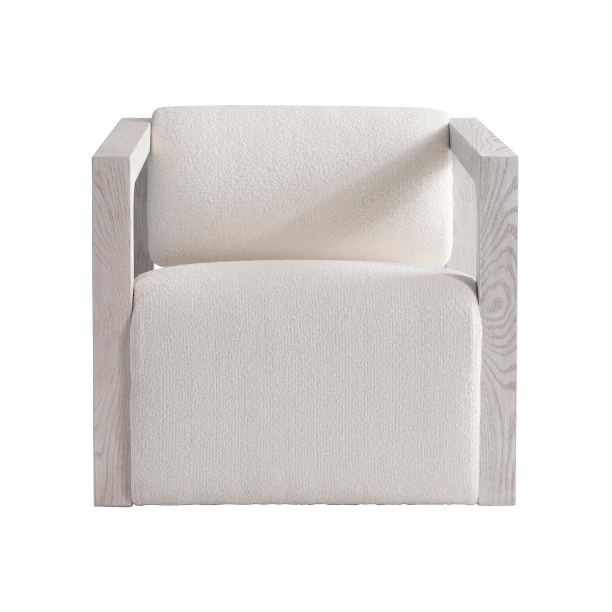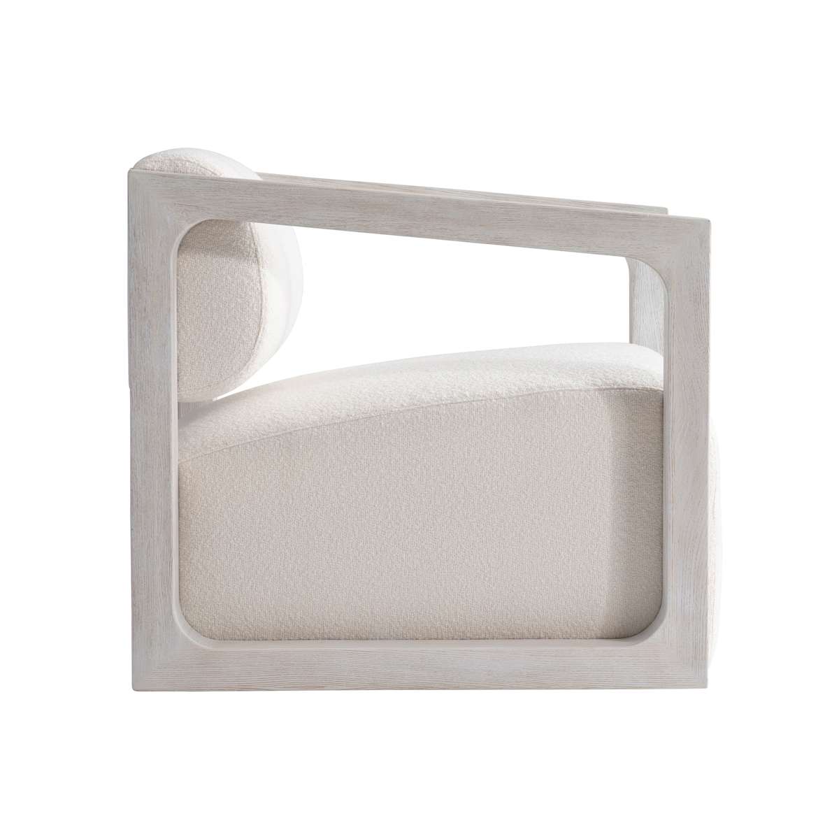 The Mica Swivel Chair by Bernhardt delivers a bold, modern look with its asymmetrical arms and smooth 360-degree swivel base. Upholstered in a soft ivory bouclé fabric, this accent chair features a foam-wrapped seat cushion and a tight back for structured comfort. Its clean, sculptural silhouette makes it a standout piece in any contemporary living space. The Mica Chair is available in a variety of fabrics through our custom order program, allowing you to personalize it to suit your style.