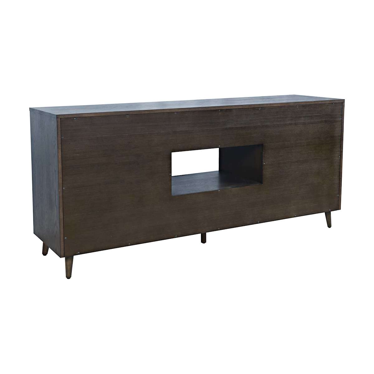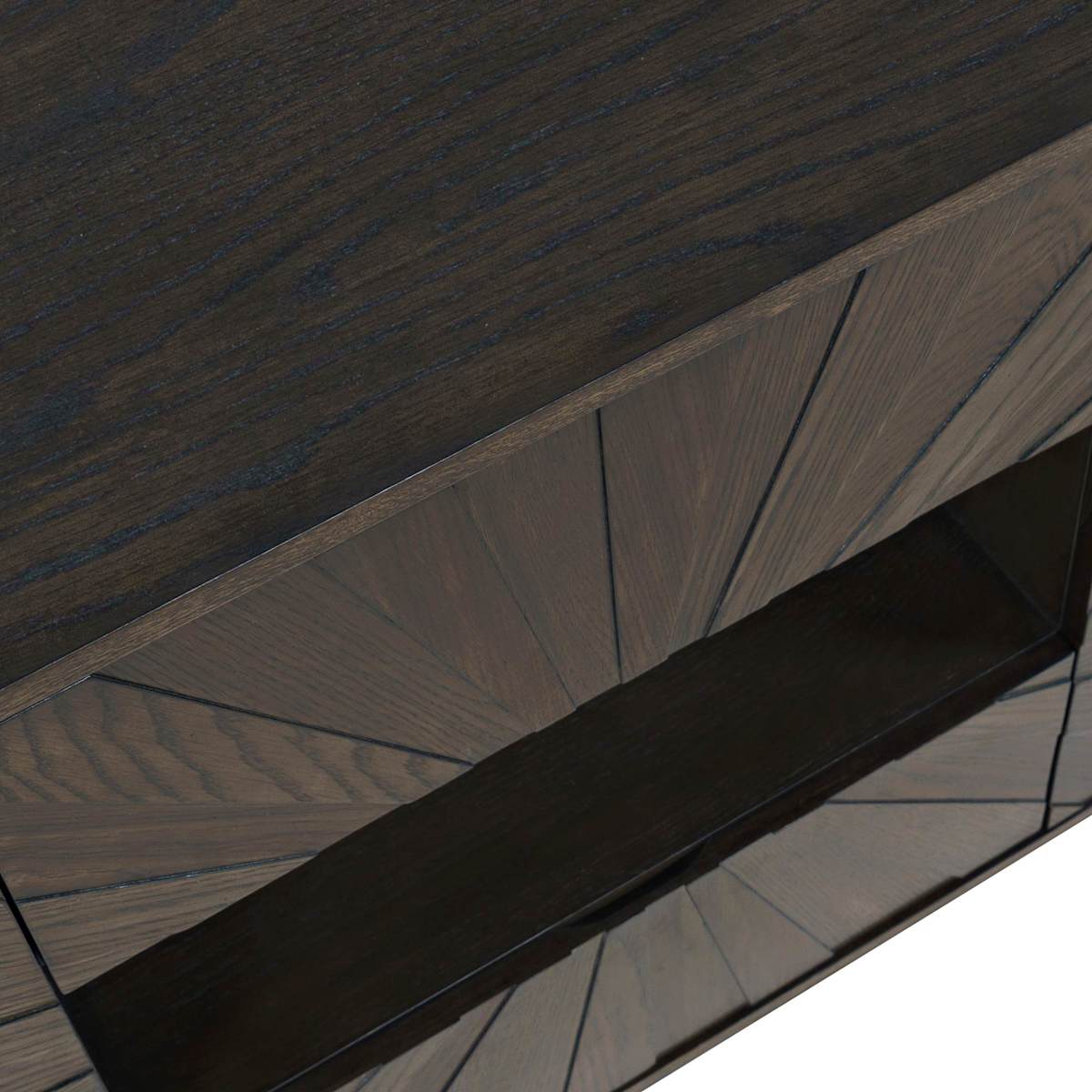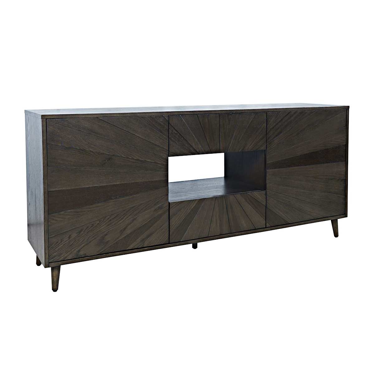 The Reece 70-inch Console brings a perfect blend of style and function to your living space. Crafted from acacia solids and white oak veneers in a rich americano finish, the console features a striking planked sunburst design on the front that adds visual appeal and texture. This versatile console features two drawers for convenient storage, along with two doors that open to reveal two adjustable/removable shelves, allowing for customizable storage to suit your needs. A center open shelf provides additional space for media components or decorative accents. Additional features include wire management and adjustable levelers. Console can accommodate up to 82-inch TV.