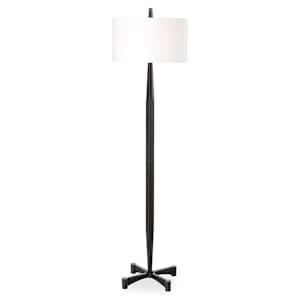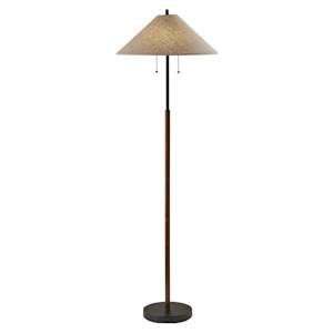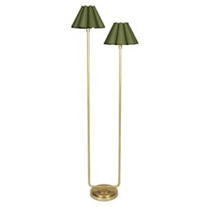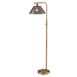 The Torill Floor Lamp features a weathered antique brass finish and a beige linen shade.