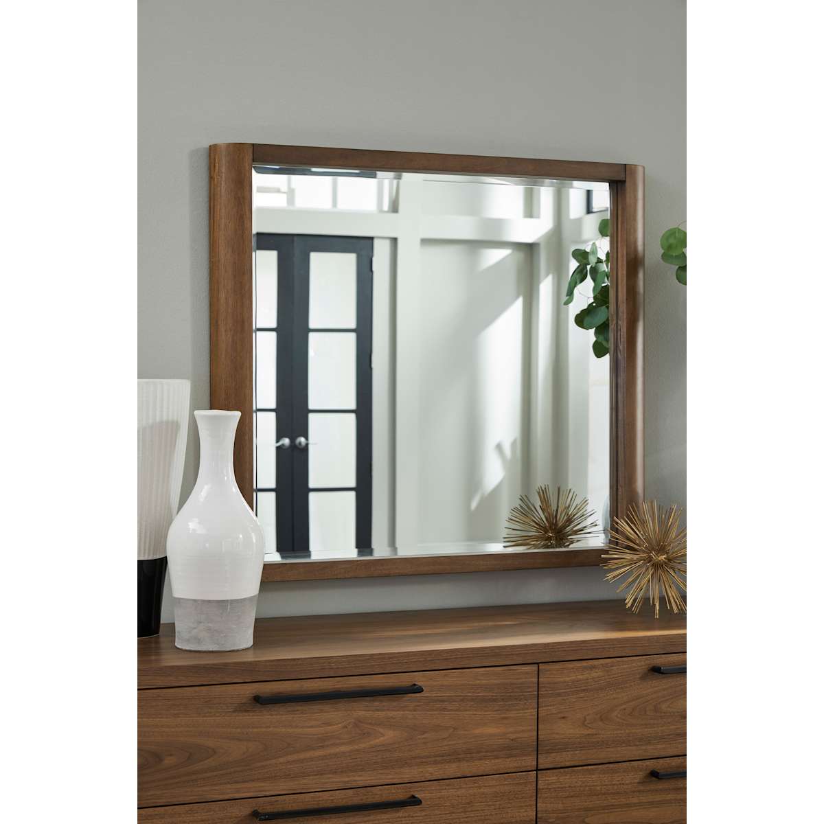 The Totes Mirror features walnut veneer and solid white teak in an English Walnut finish, with a 1-inch beveled mirrored glass that can be mounted to the dresser or hung on the wall.