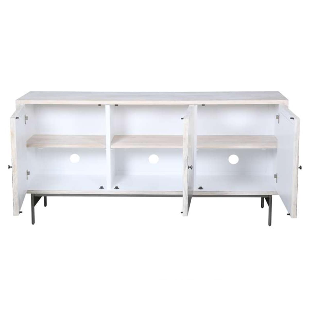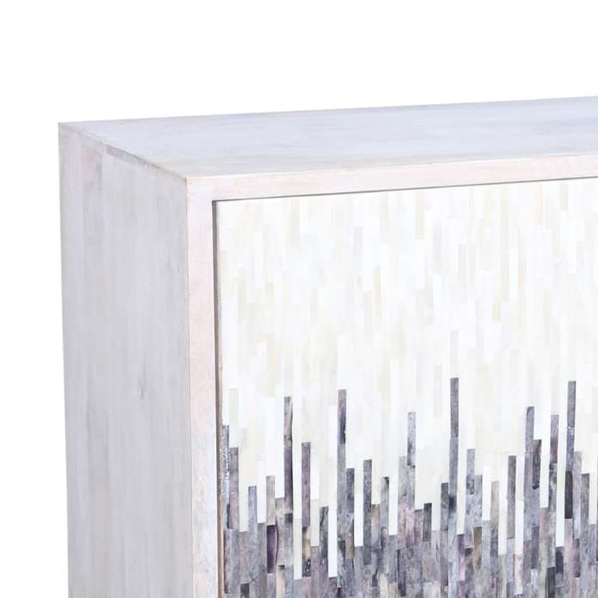 The Zahra Entertainment Console is crafted from mango wood, bone resin, and metal, it features a sleek white wash finish paired with a soft pewter metal base, creating a chic, minimalistic look. The striking ivory and blue bone inlay on the front doors adds a bold, artistic touch. Three spacious doors open to reveal three adjustable shelves. With convenient wire management and adjustable levelers, this console offers the perfect balance of storage and organization. Elevate your living room or media room with this one of a kind piece that exudes both elegance and practicality!
